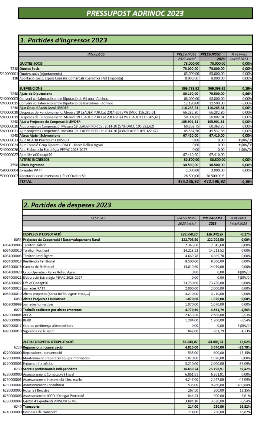 S’actualitza l’import de l’ajut previst per la Diputació de Barcelona a través del Conveni col·laboració entre la Diputació de Barcelona i ADRINOC, que es manté el mateix import que el 2022 a l’espera de renovar el conveni durant aquesta anualitat.