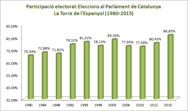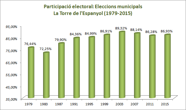 Descripció En aquest apartat es poden consultar els resultats de les eleccions municipals a la Torre de l'Espanyol des de 1979 fins a l'actualitat. També es pot consultar l'evolució de la participació electoral al llarg de les diverses convocatòries. Les dades són extretes del Departament de Governació i Relacions Institucionals de la Generalitat de Catalunya, concretament de l'Àrea de Processos Electorals i Consultes Populars.