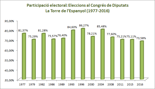 Descripció En aquest apartat es poden consultar els resultats de les eleccions al Congrés de Diputats a la Torre de l'Espanyol des de 1979 fins a l'actualitat. També es pot consultar l'evolució de la participació electoral al llarg de les diverses convocatòries. Les dades són extretes del Departament de Governació i Relacions Institucionals de la Generalitat de Catalunya, concretament de l'Àrea de Processos Electorals i Consultes Populars.