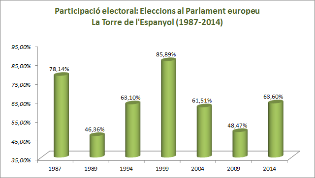 Descripció En aquest apartat es poden consultar els resultats de les eleccions al Parlament europeu a la Torre de l'Espanyol des de 1987 fins a l'actualitat. També es pot consultar l'evolució de la participació electoral al llarg de les diverses convocatòries. Les dades són extretes del Departament de Governació i Relacions Institucionals de la Generalitat de Catalunya, concretament de l'Àrea de Processos Electorals i Consultes Populars.