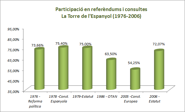 Descripció En aquest apartat es poden consultar els resultats dels referèndums i consultes que han tingut lloc a la Torre de l'Espanyol des de 1976 fins a l'actualitat. També es pot consultar l'evolució de la participació electoral al llarg de les diverses convocatòries. Les dades són extretes del Departament de Governació i Relacions Institucionals de la Generalitat de Catalunya, concretament de l'Àrea de Processos Electorals i Consultes Populars.