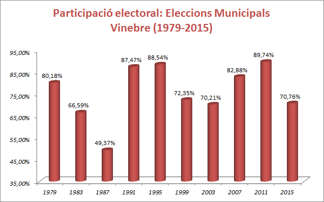 Descripció En aquest apartat es poden consultar els resultats de les eleccions municipals a Vinebre des de 1979 fins a l'actualitat. També es pot consultar l'evolució de la participació electoral al llarg de les diverses convocatòries. Les dades són extretes del Departament de Governació i Relacions Institucionals de la Generalitat de Catalunya, concretament de l'Àrea de Processos Electorals i Consultes Populars.