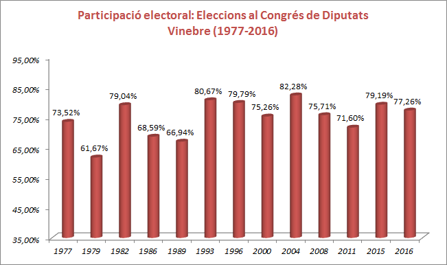 Descripció En aquest apartat es poden consultar els resultats de les eleccions al Congrés de Diputats al municipi de Vinebre des de 1977 fins a l'actualitat. També es pot consultar l'evolució de la participació electoral al llarg de les diverses convocatòries. Les dades són extretes del Departament de Governació i Relacions Institucionals de la Generalitat de Catalunya, concretament de l'Àrea de Processos Electorals i Consultes Populars així com del Ministeri d'Interior a través de la Direcció General de Política Interior.