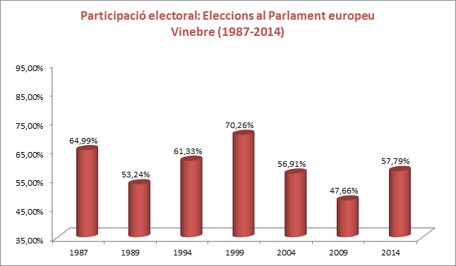 Descripció En aquest apartat es poden consultar els resultats relatius a les Eleccions al Parlament Europeu al municipi de Vinebre des de 1987 fins a l'actualitat. També es pot consultar l'evolució de la participació electoral al llarg de les diverses convocatòries. Les dades són extretes del Departament de Governació i Relacions Institucionals de la Generalitat de Catalunya, concretament de l'Àrea de Processos Electorals i Consultes Populars.