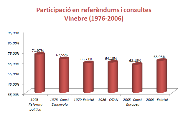 Descripció En aquest apartat es pot consultar el resultat de les diferents convocatòries de consultes o referèndums convocades en tots els nivells, concretament amb els resultats i la participació assolida a Vinebre. Les dades són extretes del Departament de Governació i Relacions Institucionals de la Generalitat de Catalunya, concretament de l'Àrea de Processos Electorals i Consultes Populars.