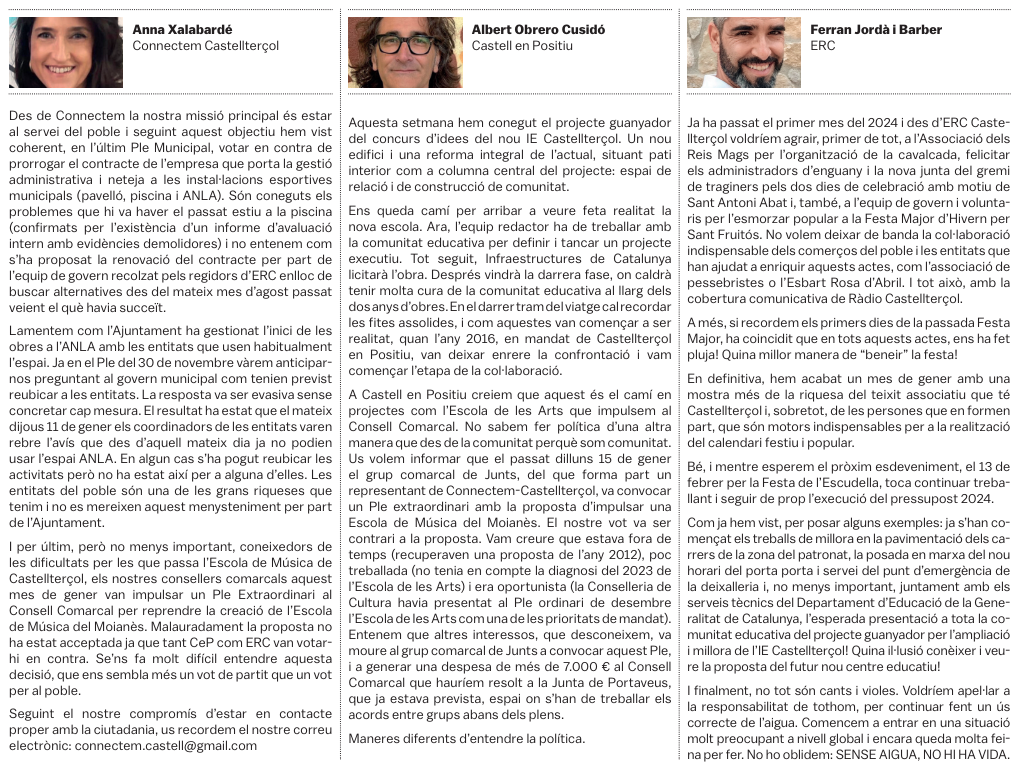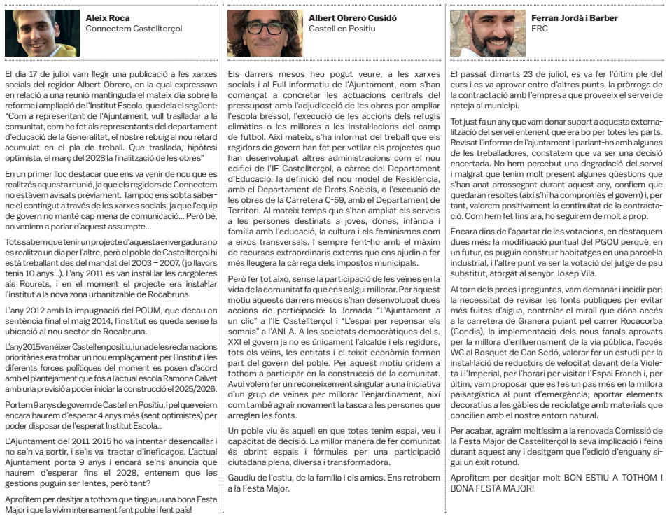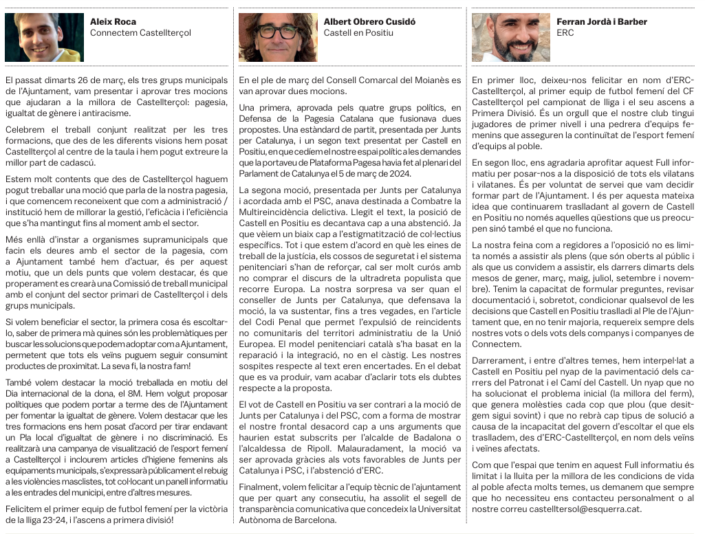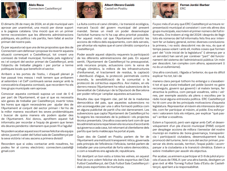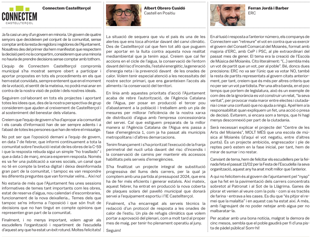 Tots els grups municipals amb representació a l'Ajuntament de Castellterçol cada mes disposen d'un espai d'opinió a la publicació del full informatiu.