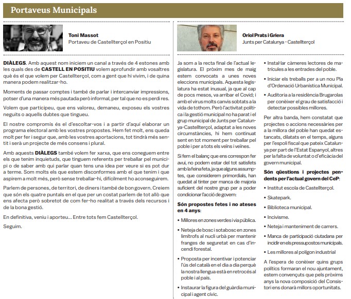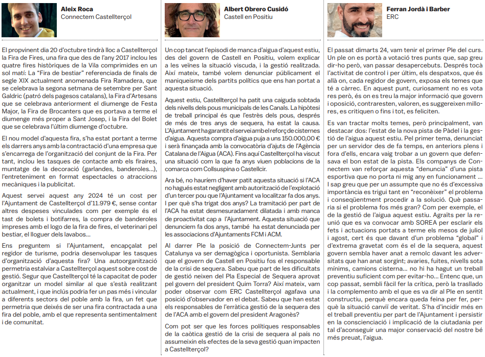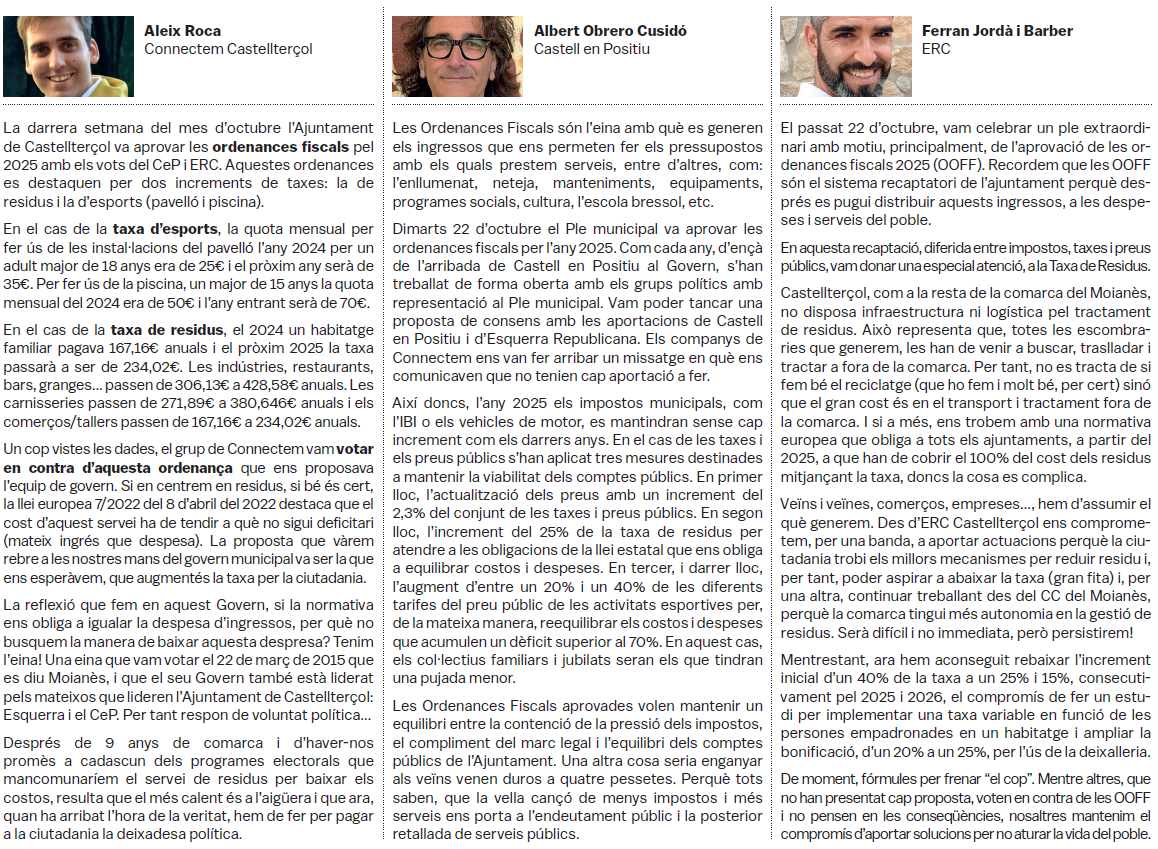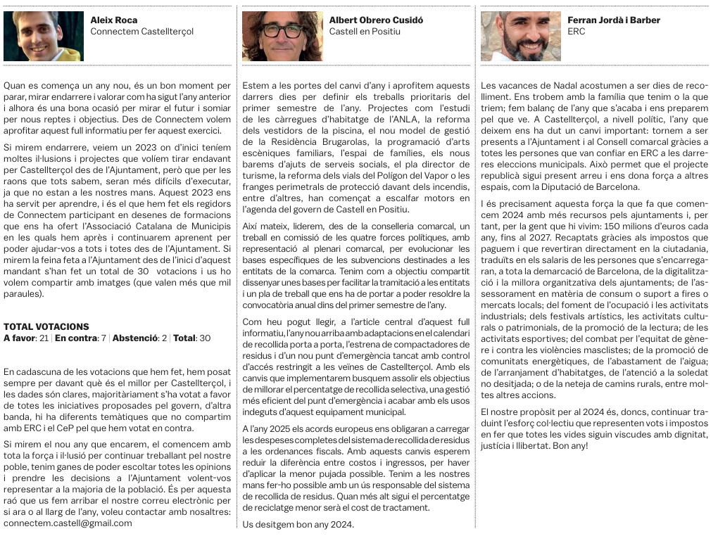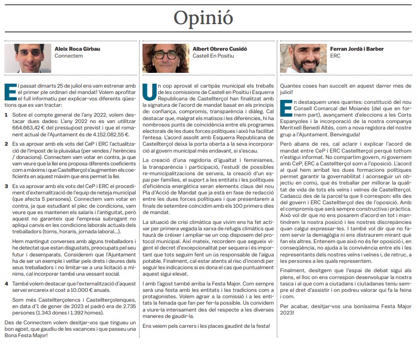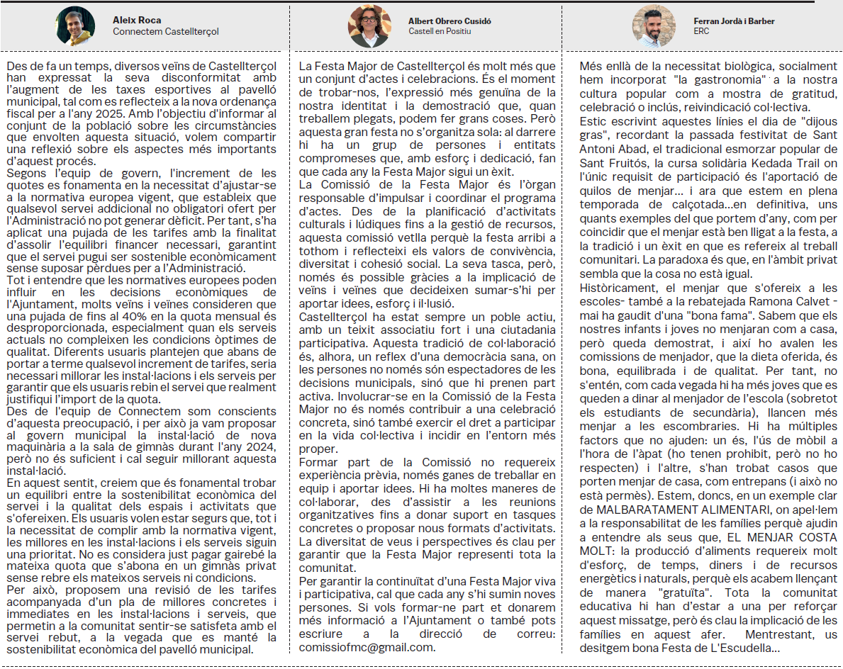 Tots els grups municipals amb representació a l'Ajuntament de Castellterçol cada mes disposen d'un espai d'opinió a la publicació del full informatiu.