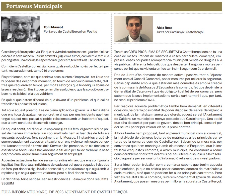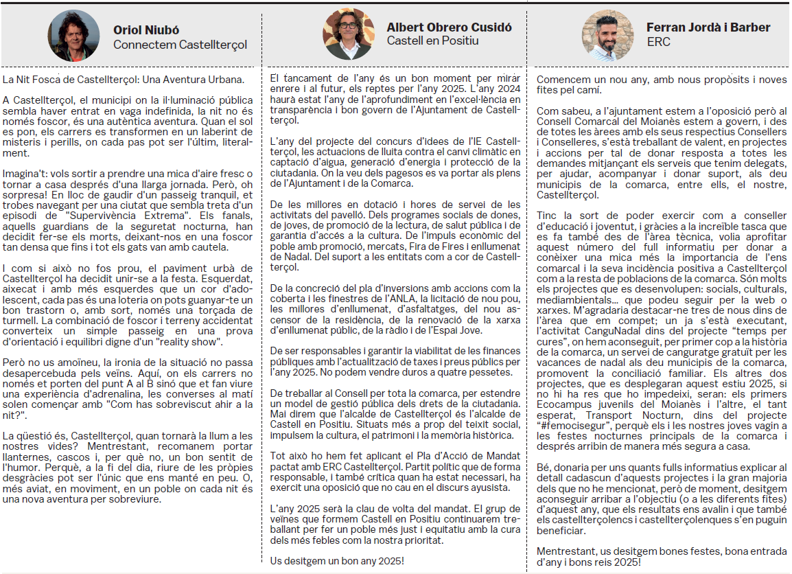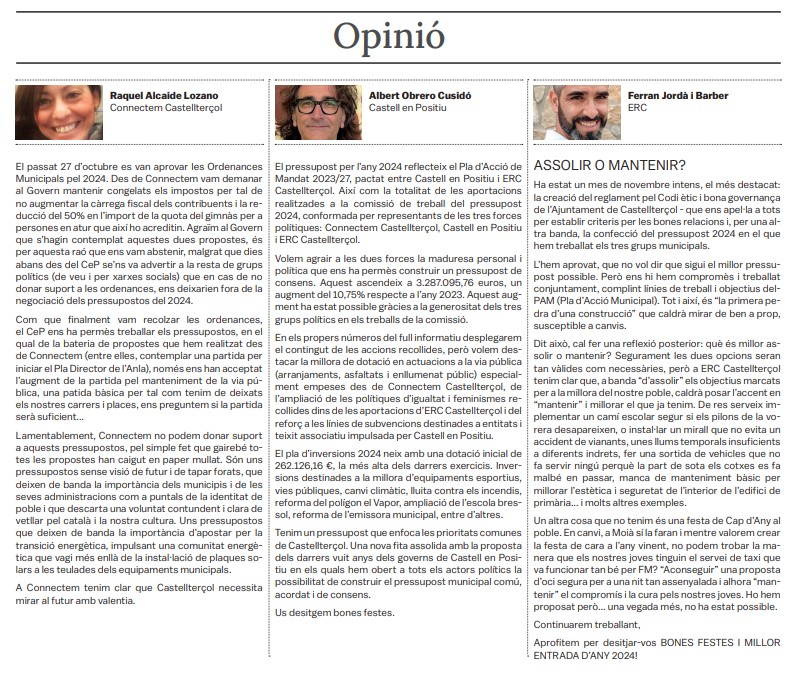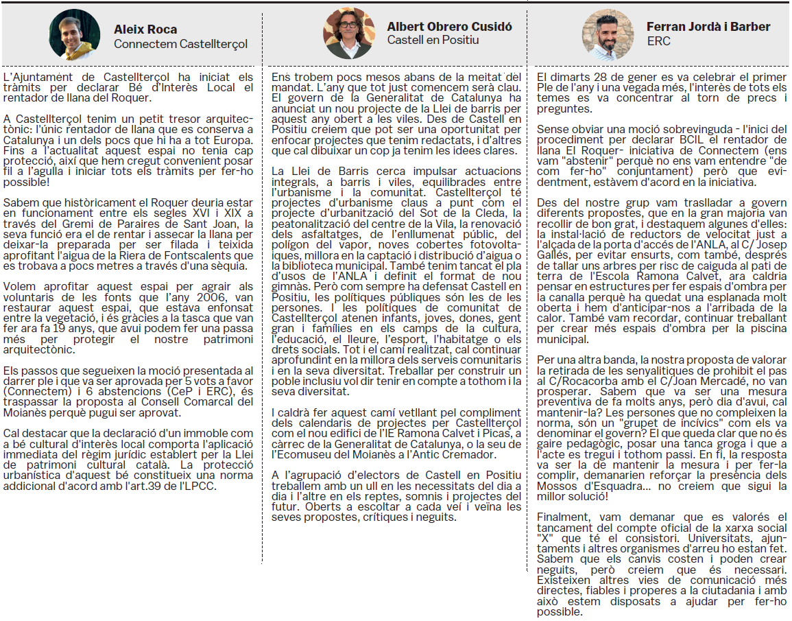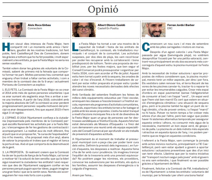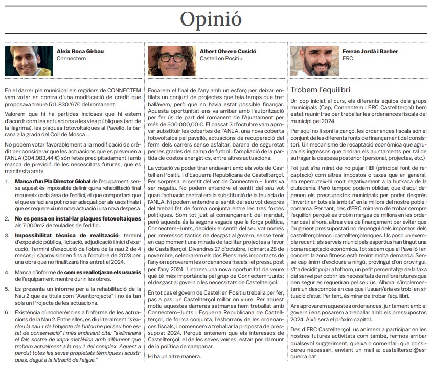 Tots els grups municipals amb representació a l'Ajuntament de Castellterçol cada mes disposen d'un espai d'opinió a la publicació del full informatiu.