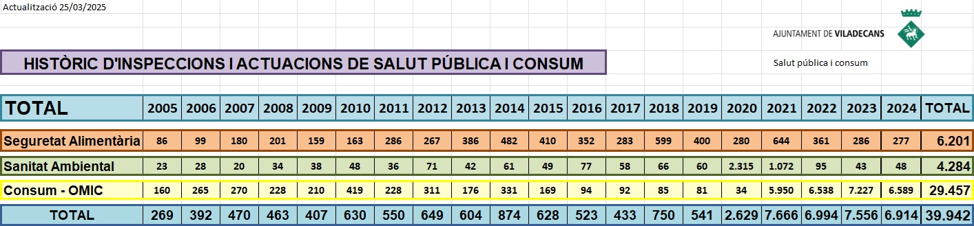 En virtud de estas competencias y funciones, el Ayuntamiento de Viladecans realiza inspecciones en los ámbitos de Seguridad Alimentaria, Seguridad Ambiental y Consumo. Ponemos a su alcance, los datos relativos de estas inspecciones desde el año 2005. Esta información se actualizará con una periodicidad anual.